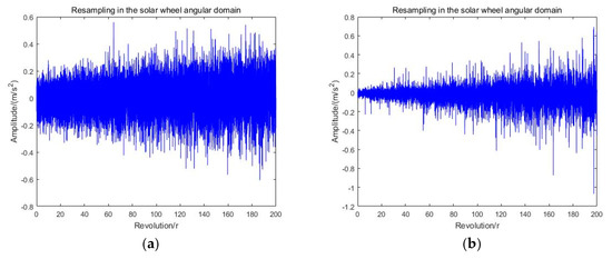 Resampling angular domain signal and its envelope spectrum waveform. (a) the waveform of resampling signal in healthy state; (b) the waveform of the resampling signal for sun wheel failure.