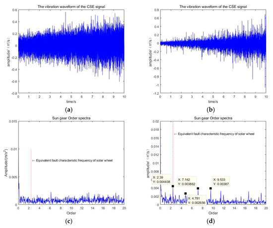 The method based on TDR and VMSMF proposed in the paper is used to analyze the health state of planetary gearbox and the fault state signal of first stage solar wheel. As can be seen from Figure 17c,d, the signal of healthy state has no obvious frequency peak at the position of the equivalent frequency of solar wheel failure red mark. For the fault signal of sun wheel, the fault characteristic frequency was 2.39 Hz, 4.781 Hz, 7.142 Hz, and 9.533 Hz. According to the calculation method of the equivalent fault characteristic frequency of the planetary gearbox, the above frequencies correspond to the equivalent fault characteristic frequency of the sun gear and two, three, and four times of the frequency, and the noise is effectively suppressed. The effectiveness of the method is verified by analyzing the vibration signals of the planetary gearbox sun gear in each fault state.