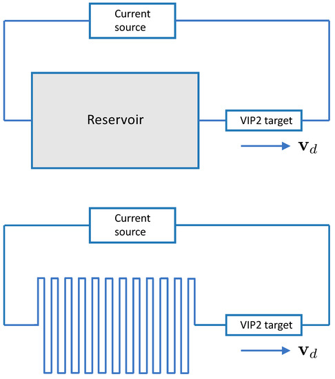 Circuit scheme for the VIP2 experiment. Upper panel: the motion of the conduction electrons is driven by a current source that produces a drift speed in the VIP2 target. The electrons flow from a large copper reservoir into the target. The reservoir is designed to provide a sufficient flow of “new” electrons so that the fraction of anomalous electrons (those with the wrong symmetry pairing with electrons in the target) is not readily exhausted by running the same electrons again and again through the target. Lower panel: for simulation purposes, the large bulk reservoir is replaced by a very long wire, and the drift speed is uniform throughout the circuit.