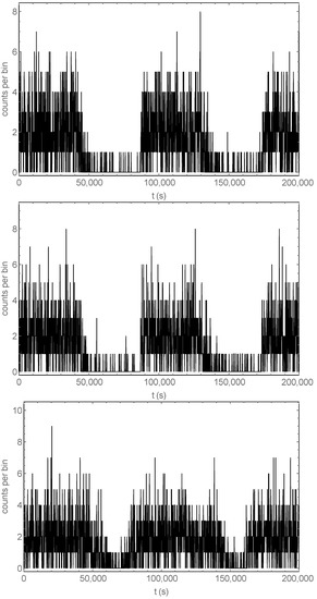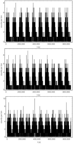 Signals obtained with Nrepeats = 10, nrepeat = 10,000, and T0 = 86,400, for different initial conditions and modulation types. All panels show the X-ray counts in 100 s time bins vs. time. Top panel: randomly distributed electrons in the initial configuration; current is modulated with a square wave between a maximum value of 180 A and a minimum of 0 A. Center panel: electrons are initially equidistributed (fixed 1 m spacing), although the position of the first electron is random; current is modulated with a square wave between a maximum value of 180 A and a minimum of 0 A. Bottom panel: randomly distributed electrons in the initial configuration; the current is modulated with a sine wave between a maximum value of 180 A and a minimum of 0 A.