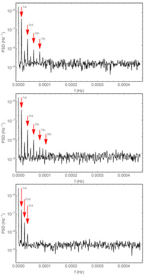 Power spectral densities (PSD, or periodograms) obtained from the Fourier analysis of the signals (X-ray counts) shown in Figure 3. Top panel: randomly distributed electrons in the initial configuration; current is modulated with a square wave between a maximum value of 180 A and a minimum of 0 A. Center panel: electrons are initially equidistributed (fixed 1 m spacing), although the position of the first electron is random; the current is modulated with a square wave between a maximum value of 180 A and a minimum of 0 A. Bottom panel: randomly distributed electrons in the initial configuration; the current is modulated with a sine wave between a maximum value of 180 A and a minimum of 0 A. The red arrows show the expected positions of the most relevant harmonics of the fundamental frequency ( Hz).