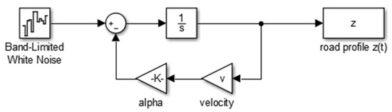 We implemented a white noise filtration method for the generation of road profile expressed by Equation (2). Using the Simulink model (Figure 1), we solved the equations using the Runge-Kutta method. In the provided model, the “band-limited white noise” block generates white noise with the specified parameters. The ideal white noise is a mathematical convenience and cannot be generated numerically due to its infinite variance, but an approximation in the form of band-limited white noise is useful for simulation. We are taking into account, that the band-limited white noise block specifies a two-sided spectrum, where the parametric units have a dimension as Hz. To get a one-sided averaged PSD, where the units are the square of the magnitude per unit of radial frequency (Mag^2/(rad/sec), we need to multiply the block delivered value by π, i.e., instead . Then, the value of parameter α is equal to 0.127 rad/m [23,25].