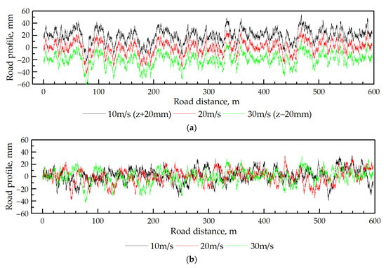 The simulation of road profile in the time domain using the white noise filtration method for three profile passing velocity values v = 10, 20, and 30 m/s was performed. Initially, calculations have been done choosing sample time values of 0.05/10, 0.05/20, and 0.05/30 s, which are equal to the required minimal time, according to the sampling theorem. The simulation times were set to pass all profile lengths of 1000 m, respectively. Next, calculations were performed using the smallest sample time value. All the obtained results were converted to the spatial domain, as presented in Figure 2. As must be expected, the profiles obtained from the first calculations are identical (Figure 2a). This method is beneficial since it could be used together with other simulations at the same time. However, the appropriate simulation parameters must be used. For example, if the velocity value changes, the sample time value must be changed as well. Otherwise, as seen from Figure 2b, the spatial road profile changes depend on the velocity similar to the roughness peaks that decrease with the velocity and the profiles that shrink when the sample time decreases. The main disadvantage of the implemented method is the lack of full control over the various characteristics.
