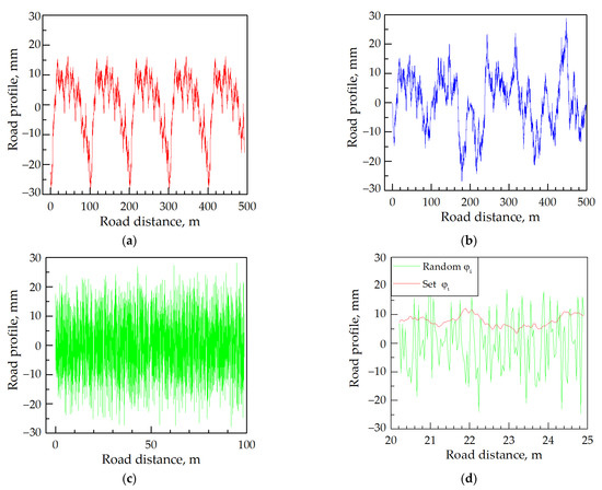 where n is the number of blocks, and i is the number of samples in the block. The result is obtained using the modified algorithm, which removes profile cycling, as shown in Figure 3b. Alternatively, in the case of another approach, it is possible to remove profile segment looping when the different random values of the initial phase φi is used as a full road profile (Figure 3c). However, the influence of waves with the long period disappears, and the abrupt shift can appear at any place (Figure 3d).