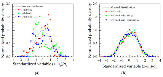 For a more detailed analysis, the Gaussianity of 100 m blocks having different random initial phases and full profiles without and with windowing was tested (Figure 4). For that purpose, histograms of separate blocks and all profiles were created, the means and standard deviations were calculated and compared with a standard normal distribution. Separate blocks with different sets of random phases have poor Gaussianity. Meanwhile, it becomes better for all profile lengths and even more after windowing (the Kolmogorov-Smirnov test decreases from 0.04 to 0.025). A few reasons could explain the poor Gaussianity: The same set of random initial phases is used in blocks; number N of sinusoids is small and should approach infinity; constant width of frequency band ∆Ω. According to Shinozuka, it is better to use a variable range of sinusoid frequency, depending on the fluctuation of the spectral density [38]. In comparison, the smaller or more delicate spacing gives better corresponding between the generated and target spectrums in the region where the fluctuation of spectral density is more rapid.