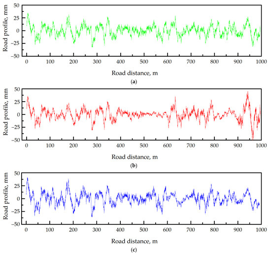 Road profiles are measured using two general types of equipment: Profilometers, which measure directly, and dynamic road response devices, which measure the rolling wheel reaction, as the dynamic response to the road surface [7,11]. The main limitation of the experimental methods is the difficulty in obtaining all profiles corresponding to the full range of possible variations, defined by the ISO (International Organization for Standardization) 8608 standard [12]. The ISO 8608 standard uses two parameters (the degree of roughness Gd(n0), identified as power spectral density (PSD) of the vertical road profile displacement, and the waviness ) to describe the road profile. The road profiles are classified as belonging to one of the classes (from A to H) provided by ISO 8608 on the basis of the Gd(n0) parameter values, while keeping the constant waviness value of .
