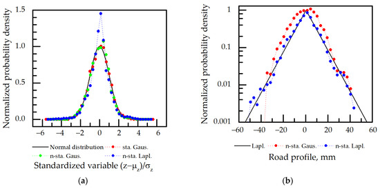 The MATLAB codes presented in [31,33] were adopted and used to simulate the road profiles in the spatial domain by the moving average method with Gaussian and non-stationary Laplace models. The kernel was defined by the ISO spectrum, which in the standardized form (variance one, waviness ) is given by: