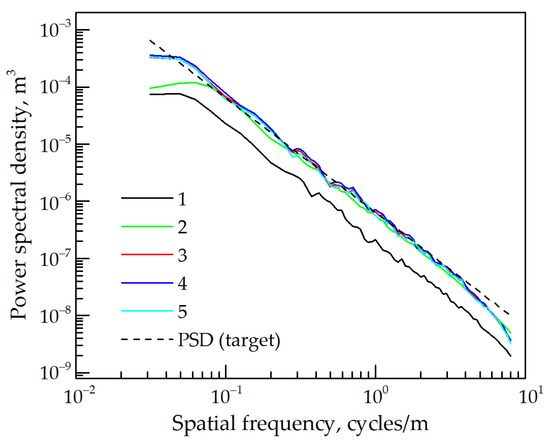 Power spectral density (PSD) spectra of the ISO 8608 road profile (dashed line) and generated road profiles using: 1—White noise filtration, 2—sinusoidal approximation and moving average of white noise, 3—stationary Gaussian model, 4—non-stationary Gaussian model, 5—non-stationary Laplace model.