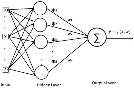 The MLP is a fully connected feed-forward ANN. The architecture consists of three or more layers (one input layer, one or more hidden layers, and one output layer) of non-linearly activating nodes. Due to the fully connected architecture, each node in one layer connects with a certain weight to every other neuron to the following layer. The conventional MLP architecture with one hidden layer is shown in Figure 1. As shown in the figure, the neurons in the hidden layer apply a non-linear activation function () to map the weighted inputs to the outputs of neurons, making it particularly suitable for distinguishing non-linearly separable data. The function that approximates the actual response in MLP is as follows: