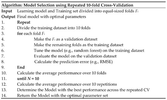 A grid search was integrated with a repeated k-fold cross-validation (CV) technique for choosing the most optimized parameters for the ML models and the final model selection [35]. Different hyper-parameters of nine ML models (see Table 5) were optimized such that average prediction error would be minimized on training data. At each fold in the CV, a model was fit on the subsets of training data. The fitted model was then evaluated on the hold-out validation dataset by calculating the RMSE of the prediction. This process was performed k-times with the desired number of repetitions. The model that minimized the average RMSE across the repeated CV was selected as the final model and its corresponding parameters were identified as the optimized ones. In a simple mathematical notation, the following optimization problem was attempted to be solved: