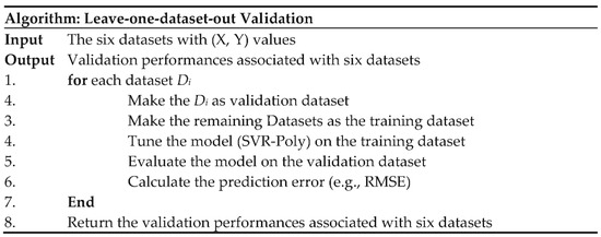 The results of the leave-one-dataset-out validation are presented in Table 8. All the validation experiments were performed using the best performing SVR-polynomial kernel model. The test performances were evaluated using a similar set of evaluation metrics presented in Table 9.