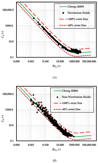 As mentioned earlier, the implicit method of predicting Vs requires using a CD-Rep or CD-ReG correlation to iteratively predict Vs in a Newtonian or non-Newtonian fluid. Although many CD-Rep correlations are available in the literature, all of those were proposed for Newtonian fluids. Originally, Cheng [4] also proposed the correlation for Newtonian rheology. Later, the model was extended by replacing Rep with ReG to different non-Newtonian fluids [7,20,23]. The results of applying this correlation to the current dataset are presented in Figure 4 by plotting CD against Rep and ReG for Newtonian and non-Newtonian fluids, respectively. As expected, the performance of the Cheng correlation is better for Newtonian fluids compared to the non-Newtonian fluids. Most of the measured values collapse over the model curve for Newtonian fluids. For non-Newtonian fluids, the uncertainty of prediction is considerably high. It can be less than −60% and more than 200% for the current dataset. The values of the model coefficients determined empirically for Newtonian fluids do not necessarily account for the variation in viscosity due to shear in non-Newtonian fluids. That is why this kind of correlation is usually validated and modified before using for a non-Newtonian fluid. The associated complexities and uncertainties render predicting Vs using a CD-Rep correlation an inconvenient option for an engineer.