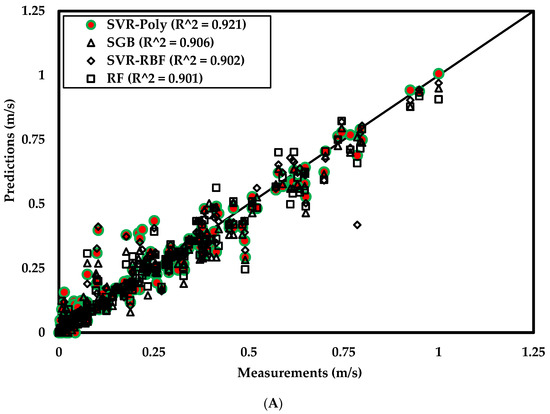A wide range of ML models was selected for modeling the Vs of spherical particles in the present study to develop a generalized model applicable to both Newtonian and non-Newtonian fluids. Parametric regression models, such as SVR, MLP, NN, as well as non-parametric regression models such as KNN, including a comparatively latest approach called Bayesian regression were considered. Among the Bagging and Boosting algorithms, RF and SGB were selected. Table 6 shows the results of ML modeling of the selected regression models through repeated cross-validated training. Among all models, the best model was the SVR-Polynomial kernel (R2 = 0.921) with the optimized values of the parameters, such as degree-d of the kernel as three (3), input scaling parameter as 0.1, and the regularization parameter as 1 (see Table 5). As modeling Vs associates non-linear feature interactions, non-linear ML models were found to have superior performances. In the case of SVR, both RBF and Polynomial kernel map the input space to higher dimensional feature space, and, subsequently, the problem becomes linearly separable into that feature space. The SVR-Polynomial kernel demonstrated better performance than its RBF kernel counterpart in the case of independent test data prediction (see Table 7 and Figure 7). It should be noted that the SVR-Poly yielded comparable values of R2 for both training and test datasets (R2 = 0.931 for training dataset; R2 = 0.921 for test dataset), which demonstrates the robustness of the model. The second-best model was the SGB (R2 = 0.906), which is the stochastic version of the general gradient boosting algorithm. The SVR–RBF along with the RF ranked as the third-best model with an identical R2 value of 0.901 for the test dataset. It is important to observe that both bagging (RF) and boosting (SGB) algorithms with stochastic components were found to perform well either by choosing the best possible random set of predictors (RF) or observations (SGB) for splitting at each node of the regression tree and iteration of minimizing the objective loss function. Both models were able to capture the non-linearity of the data and accurately estimate the actual response.