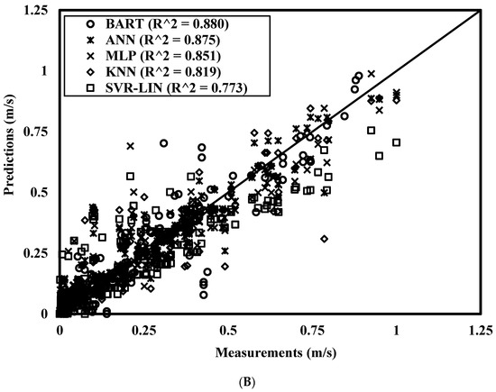 Nine regression algorithms, ranging from parametric and non-parametric models to Bayesian regression were tested to perform the ML modeling of the settling velocity. Specifically, support vector regression with radial basis function (SVR-RBF) kernel, SVR with polynomial (SVR-polynomial) kernel, and SVR with linear (SVR-linear) kernel along with RF regression, SGB, BART, KNN regression, MLP, and ANN algorithms were selected for the current study. A brief explanation of each regression algorithm is presented below highlighting the statistical formulation of the estimated response with the input parameters [30,31,32,33,34,35,36,37,38,39,40,41,42,43,44].