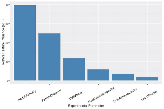 One of the important aspects of the current study is a comprehensive feature importance analysis. A leave-one-feature-out strategy was used with six experiments for the purpose. It involved training and testing the model by excluding one feature at a time. The SVR-Polynomial kernel model was used for these experiments because of its superior performance over other ML models on an independent test set. A new set of R2 values were obtained from the leave-one-feature-out experiments. Then, the R2 values obtained before and after excluding each feature were compared. A relative feature importance indicator was used by taking into account the differences observed in R2 values in the presence or absence of a specific feature. The RFI indicates the influence of a feature on the model in relation to the R2 metric. A decreased ranking-order of the features can be obtained based on their RFI values. As shown in Figure 8, the Particle Density and the Particle Diameter are identified as the two most significant features having respective RFI values of 39.6 and 24.8, followed by a decreasing rank-order of Yield Stress, Flow Consistency Index, Flow Behavior Index, and Liquid density. Specifically, the ordering of the features from the highest to lowest ranks is as follows: ρs > ds > τo > K > n > ρl (Figure 8). A similar trend of feature influence was reported in a previous ANN-study [1]. It can be explained with the physics of the settling process. The motion of a particle in a stationary fluid is triggered by the gravitational force (FG). When it is released in the fluid, an acceleration of g (~9.81 m/s2) acts on it. Afterward, the motion of the particle in the fluid actuates a drag force (FD) on itself. Its incremental velocity also intensifies FD. When FD nearly matches FG, an equilibrium condition persists and the particle continues moving at a constant velocity known as the settling velocity. Thus, the opposing forces ensue Vs. The primary force in this process is FG, which is strongly dependent on a spherical particle’s density and size or diameter. The dependency is conceivably stronger on ρs than ds. On the other hand, FD is the secondary force stemmed from the particle motion. It is known to be a strong function of Newtonian fluid viscosity and weakly dependent on ρl. For the non-Newtonian fluids considered in the current study, the rheology was modeled with yield stress, flow consistency index, and flow behavior index. The most important among these parameters is τo as FD cannot be actuated until FG overcomes it. The viscosity of the non-Newtonian fluid is denoted with K while its shear-thinning behavior is signified with n. Understandably, K plays a more significant role than n in the settling process. Thus, the feature-importance, as shown in Figure 8, is in sync with the physics of the particle settling phenomenon. It justifies the utility of the MLA in predicting Vs.