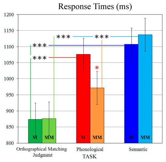 Analysis of response times (RTs) revealed a significant two-way task × condition interaction (F2,38 = 6.04, p < 0.01, HF ε = 0.83, η2 = 0.24), with faster RTs on the orthographical matching judgment task than on the phonological (all ps < 0.05) and semantic tasks (all ps < 0.001), in both match and mismatch conditions (Figure 1).