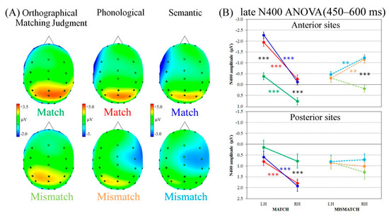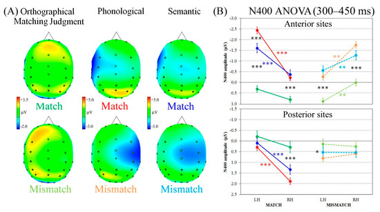The second time window analyzed (300–450 ms interval following W2 onset) showed a clear negative wave, the N400, with opposite laterality patterns of activation depending on match or mismatch condition. Indeed, as can be seen in the top row of Figure 3A, in the match condition a clear negativity appeared on left sites during phonological and semantic processing, but not during the orthographical matching judgment task. When words mismatched, instead, the negative wave developed at the right anterior-central electrodes, particularly during both linguistic tasks (bottom row of Figure 3A).
