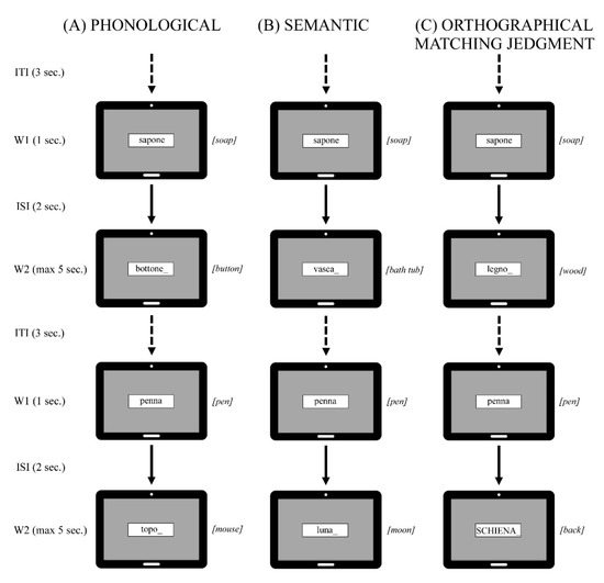 Graphical representation of stimuli and tasks showing trial structure with first word presented (W1), Inter-Stimulus Interval (ISI), second word (W2) and Inter-Trial Interval (ITI) during (A) Phonological, (B) Semantic and (C) Orthographical Matching Judgment task. An example of matching (top panel) and mismatching (bottom panel) conditions is represented.