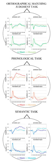 For each time window, the ANOVA included the following variables: task (three levels: orthographical matching judgment vs. phonological vs. semantic), condition (two levels: match vs. mismatch), region (two levels: anterior vs. posterior), and laterality (two levels: left vs. right side). Post hoc comparisons were computed using the Tukey HSD test (p < 0.05), and the Huynh-Feldt correction was applied when necessary (that is, when variables with more than two levels, e.g., task factor, were involved [42]).