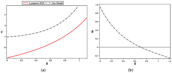 As a first task, let us investigate how the integration constant C behaves as a function of the non-extensive phenomena parameter , with the two being related by Equation (42). In Figure 1a, we plot the non-extensive parameter, , versus the constant of integration C given by using Equation (42) and we can compare our result with the one studied in Reference [91], appearing in red color. The difference in the behavior of the versus the constant C between our model and the model presented in Reference [91] is due to the contribution of modified higher–order torsion theory.