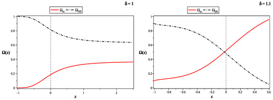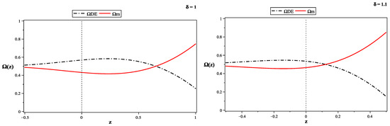 In Figure 2 we present the evolution of the dark energy and matter density parameters for (left plot), and for (right plot). As it obvious from Figure 2, the effect of the parameter is significant.