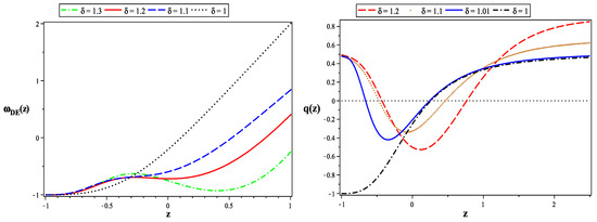 In this section, we shall perform a numerical analysis, and we shall investigate the behavior of several quantities of cosmological interest as functions of the redshift. Particularly, we shall be interested in the matter–energy density parameter , the dark energy density parameter , the dark energy EoS parameter and the deceleration parameter . All these quantities are calculated in the absence of relativistic matter and we shall leave as free parameter the non-extensive parameter which is constrained by the non-extensive statistics [4] and it is believed that it should be greater than unity [94,95].