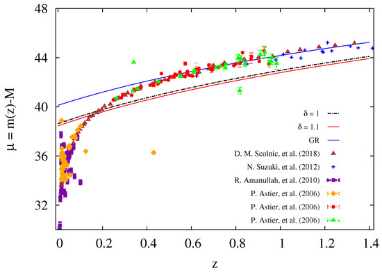 Finally, the distance modulus is calculated and plotted in Figure 5 using Equation (54) for different values of the non–extensive parameter, namely . For the sake of comparison we also plot the distance modulus of GR in Figure 5 appearing in blue solid curve. It is clear that, the distance modulus is consistent with the observational data presented in References [98,99,100,101] at . According to the Hubble Space Telescope [102], we find that there is an agreement between our results for which means that the modified gravitational theory can describe the fainter stars better than the brighter ones that is, at larger redshifts.