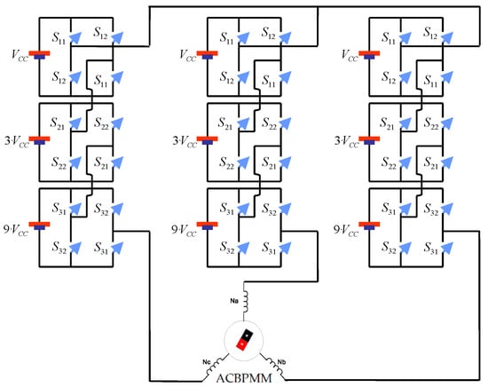 Then, a three-phase multi-level inverter with 27 levels of voltage per phase is considered to control this motor. This type of inverter has the advantage of reducing the high commutation frequency required by a permanent magnet motor, as shown in Figure 1.