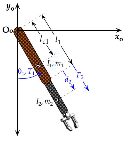 Equations (1) and (2) show the dynamic system of a 2-DoF robotic arm with rotational and prismatic joints, where  is the mechanical torque of the arm in the first rotational joint, and  is the force that the second link exerts over the first one.