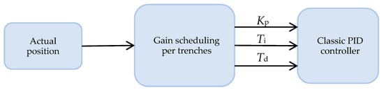 This control strategy—whose results are shown and commented in the next section—stabilizes the robotic arm at different reference values and eliminates the stable status. However, the system is observed to be unstable when changing the reference position between one work area and another. Therefore, to avoid further divisions of the work areas, PID parameters are modified in the limit between trenches. The strategy used in this case, gain scheduling by interpolation, is presented below.