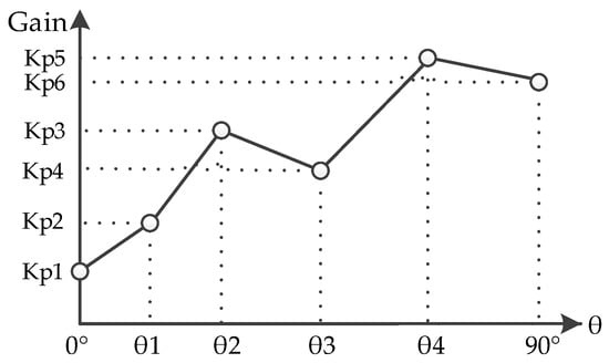 In this second type of control, considering the angular position at which the robotic arm is located, the value of the controller gains corresponding to each border of the PID controller trenches is calculated through an interpolation polynomial, as shown in Figure 5. In this way, the coefficients of the PID controller parameters of the gain scheduling per trenches strategy are used, and a linear interpolation is applied to calculate the other parameters corresponding to the limits between trenches.