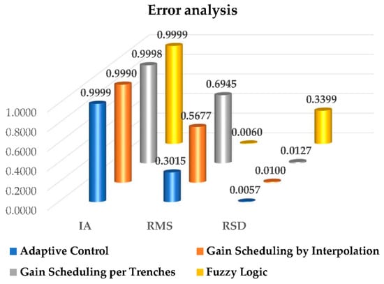Through the calculations of error indexes from the first link at all times—differently from the previous calculations, which were conducted when reaching the stable state—all control strategies are observed to have a good performance according to the indicators, as shown in Figure 19. IA has a value close to 1 for the three control strategies, and the RMS index has a value close to 0. However, big differences emerge with the RSD index, as it yields significant error for the fuzzy logic strategy, which has different values and indicates a better performance from adaptive control.