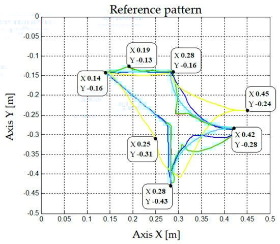 In this pattern, the differences between the control strategies are evident. Adaptive control stands out over the two gain scheduling strategies, as seen in Figure 17. This is clear in Figure 18 since, between seconds 2 and 8, where the reference of the first rotational link are quadratic functions, the adaptive control strategy performs better than the other two strategies.