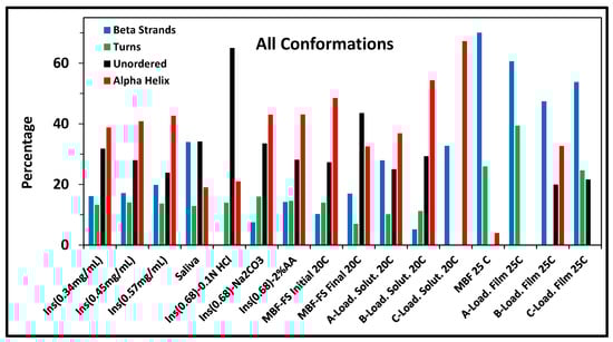 Effect of different parameters on the insulin secondary structure, expressed in percentage calculated using BestSel algorithm []. Bar chart of secondary structure estimates (SSE) of insulin in different media. The “Total β- Sheets” equals the sum of Anti1, Anti2, Anti3, and Para conformations, while the “Total α-Helix” is the sum of Helix1 and Helix2.