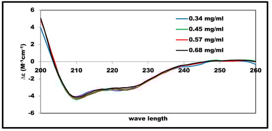 Solutions of insulin in 2% acetic acid at the examined concentrations showed very similar SRCD spectra, as illustrated in Figure 3. The estimated fractions of secondary structure components, as shown in Figure 2, were 38–41% for α-helix, 16–19% for β-sheets, and 13–14% for the turns; these values were consistent with previous studies of native insulin conformations [,].