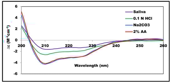 The SRCD-spectra obtained for insulin dissolved in HCl (pH ≈ 2.0), saliva simulated fluid (pH ≈ 6.85), and Na2CO3 (pH ≈ 9.0) are shown in Figure 4. For acetic acid and Na2CO3, the SRCD profiles and the SSE% values were almost similar, indicating similarity in the extent of interaction with insulin leading to negligible effect at the insulin structure. On the other hand, a noticeable difference was observed in the HCL and the saliva-simulated media. This difference was accompanied by a decrease in α-helix content from 52% to 18–20%, as observed in Figure 2. Sodium chloride, as a component of the simulated saliva solution, was reported to affect insulin structure and to enhance insulin amyloid fibril formation [].