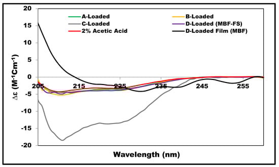 In order to examine the effect of the film components at the insulin secondary structure, SRCD-spectra were obtained for the formulations listed in Table 1 and compared to the reference spectrum obtained for insulin (0.57 mg/mL) in 2% acetic acid; the results are shown in Figure 5. For insulin solutions, the presence of chitosan (A-Loaded) or glycerin (B-Loaded) did not cause noticeable changes in insulin spectrum, while the presence of L-arginine (C-Loaded) in the solution appeared to increase the intensity magnitude. Interestingly, this effect of L-arginine was reduced when combined with glycerin, as shown in the D-Loaded solution, and it reduced further upon the film formation, as shown in the case of the D-Loaded MBF. The secondary structure estimate values (Figure 2) clearly show the reduction in the alpha helix content of the SRCD data of the D-Loaded MBF. This effect might be attributed to the change in the extent and nature of interaction between insulin and the different film components upon drying. It is well documented that L-arginine acts as an aggregation inhibitor, and it stabilizes the secondary structure of insulin [,]. At the pH (3.3) of the measured solutions, insulin is expected to be predominantly positively charged; this implies that the electrostatic attractions between the positively charged L-arginine and negative residues of insulin are not the only mechanism of the L-arginine stabilizing effect. The interaction between chitosan and L-arginine is expected to shield the insulin-destabilization effect of chitosan. In addition, previous studies have demonstrated the important role of the guanidinium side chain of L-arginine, which tends to bind to neutral hydrophilic amino acid residues through hydrogen bonding with the carbonyl group of the protein. L-arginine was also shown to bind to tryptophan residues through pi–cation interactions [,].