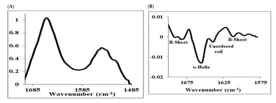 For proteins, the amide I region from 1600 to 1700 cm−1 is mostly composed of several bands corresponding to the elements of secondary structures such as α-helices, β-sheets, turns, and unordered conformations (Figure 6). The second derivative analysis of the amide I bands is used to enhance the resolution of the overlapped bands and identify the various elements of the protein secondary structure. Figure 6B shows the second derivative spectrum of insulin obtained in this study with the band at 1655 cm−1 assigned to the dominant α-helical conformation, the bands in the 1680–1695 cm−1 region and 1612 cm−1 assigned to β-sheets, and the band at 1639 cm−1 assigned to unordered conformation [,,,,,].