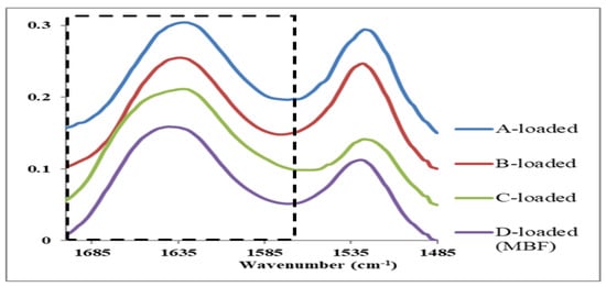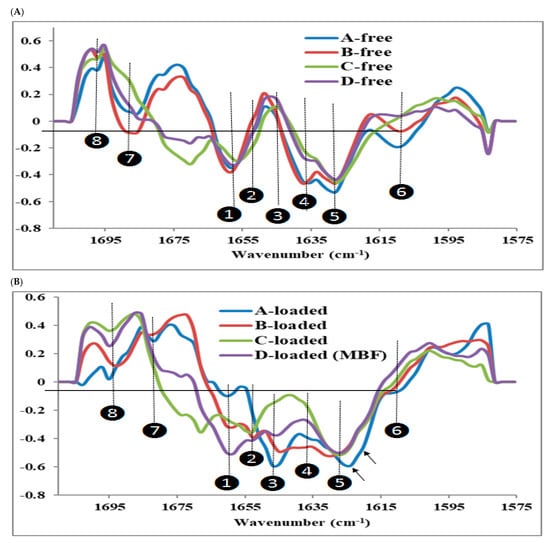 In both free and loaded B, C, and D films, no changes were observed for the peaks at position 5 of 1627.6 cm−1, which is the lower wave number associated to β-sheets. However, since it is present in both free and loaded films and that the higher wave number peak was not observed might indicate that this conformation was not present. In A-loaded film, this peak is shifted to 1623 cm−1 in addition to the emergence of a faint shoulder at 1621 cm−1, which may be due to the formation of some type of β–sheets; the latter could be indicative of the formation of β-structure typically observed in amyloid fibrils [,,,].