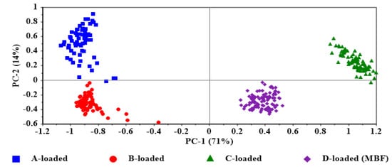 The variations in the secondary structure of insulin between different films were significant. L-arginine favors the reduction in the formation of an unordered structure and β–sheets, hence stabilizing the insulin structure. This effect may be mediated by the interaction of L-arginine with chitosan, shielding and preventing the destabilizing effect of chitosan on insulin. Although the structural differences and interactions in the matrix components contribute greatly to the inter-film separation in the PCA score plot (Figure 8), the lower intra-film spectral variability of D-loaded film (MBF) is very likely to be a consequence of the lower variability in insulin secondary structures as a result of the protective effect of L-arginine, while the higher spectral variability detected in A-loaded film reflects the variations in the insulin secondary structure induced by chitosan.