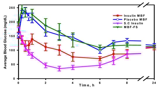 Insulin activity was evaluated using four groups of animals. The averages of the blood glucose (mg/dL) measured for all four groups from time zero to 24 h are illustrated in Figure 10.