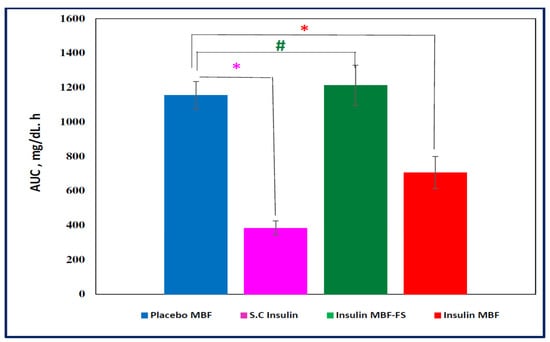 Apparent area under the 0–8 h curve (AUC, mean ± SEM) calculated for the different treated groups. * p values were significant for insulin MBF and insulin subcutaneous(S.C); 0.0014 and 0.0001 respectively versus Placebo MBF, # p values were non-significant (0.682) for insulin MBF-FS versus Placebo MBF.