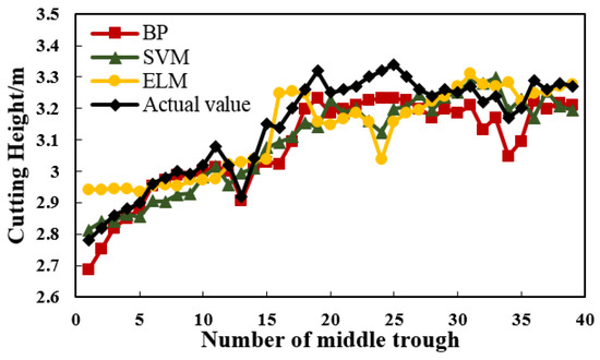 In order to select the prediction algorithm with high prediction performance, back propagation neural network (BP neural network), support vector machine (SVM), ELM are selected, RMSE, and R2 are used as evaluation indexes. The data set of this section adopts the actual drum cutting height obtained from a coal mine in Shanxi, China, with a total of 17 × 39 sequences. This section uses the cutting height of the first 16 knives to predict the cutting height of the 17th knife.
