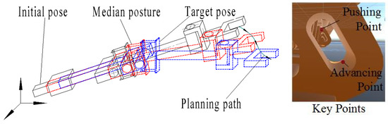 The floating connection mechanism can change the motion behaviour of each degree of freedom according to the position of the scraper conveyor, which has the general characteristics of industrial robots. Therefore, the floating connection mechanism can be transformed into an industrial robot model for research. Due to the uncertainty of the motion of industrial robot, it is necessary to plan the path based on the space dimension and time dimension. Figure 4 shows the path planning diagram of the converted manipulator and the key point location map that the end-effector needs to capture.