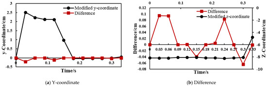 From Figure 10, it can be seen that the theoretical values of planned x-coordinates have peaks between 0.06–0.15 s, 0.15–0.24 s, and 0.24–0.3 s. Therefore, filtering is required to reach the maximum difference between the planned and actual values within 0.1 cm. After the first correction, the maximum difference of the trajectory is 0.26 cm. According to the correction results, the second correction should be carried out within 0.06–0.12 s, 0.15–0.24 s, and 0.24–0.27 s, the maximum difference between the correction results and the actual values is 0.08 cm, which meets the requirements of the correction results. Taking x-value as variable, the Cartesian path planning and Gaussian filtering correction method are used to jointly modify the y-coordinate and z-coordinate, and the correction result is shown in Figure 11.