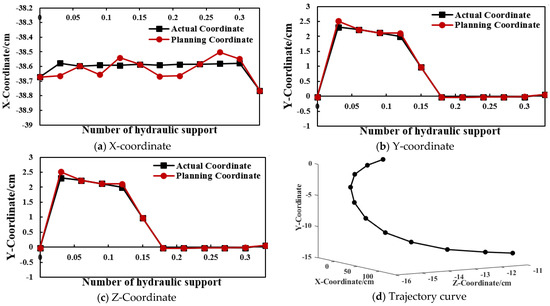 Applying the planned path to Unity3D, the path change of no. 1 hydraulic support corresponding to the middle trough is obtained; using the method proposed in this paper to plan the paths of all floating connecting mechanisms, the overall path changes of scraper conveyor can be obtained, as shown in Figure 12. By comparing the actual path curves with the predicted ones, the comparison results are shown in Figure 13.