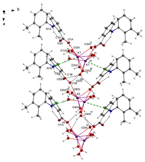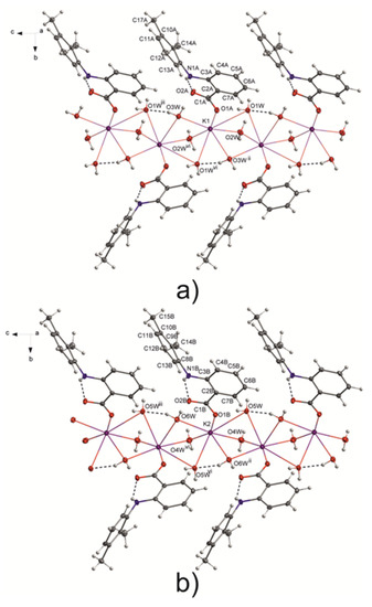 As a result of the synthesis of mefenamic acid with potassium hydroxide, a salt with a polymeric structure of the formula {K(C15H14NO2)(H2O)3} was obtained. Within the coordination polymer, each potassium ion is surrounded by six water molecules, which are potential ligands. The seventh coordination site is occupied by a mefenamate ion bound to the cation through the oxygen atom of the carboxylate group as a monodentate ligand. Considering the possibility of cation binding, the closely located aromatic rings derived from the mefenamate ion should also be taken into account. Therefore, the formation of the K…π interactions is possible, which can complete the eight coordination sphere of potassium ions. In the studied crystal, polymeric chains are present in the structure, in which two adjacent potassium ions are bridged by three oxygen atoms of water molecules (Figure 1). In the asymmetric part of the unit cell, two kinds of potassium ions (K1 and K2) are distinguished, which is related to the disorder of one of the oxygen atoms of the carboxylate group coordinated to K1 ion. The disorder was modeled over two positions (O2A and O21A) with occupancy factors 0.919(10) and 0.081(10), respectively. Both polymeric chains, involving K1 and K2, extend along the [001] direction. The bonds between potassium cations and the oxygen atoms of the carboxylate groups, water molecules and aromatic rings differ slightly for two consecutive cations, vis. K1, K2. The bond lengths and selected angles are presented in Tables S2 and S3 and in repeating themselves form a polymer chain. Except for the interaction between the potassium cations and oxygen atoms, the crystal is stabilized by a network of intermolecular hydrogen bonds O–H⋯N, O–H⋯O. The intramolecular hydrogen bond N–H⋯O is also observed (Table S4). Moreover, the polymeric chains created by K1 and K2 ions can contact each other via the K⋯π interactions mentioned above (Figure 2a,b). Namely, each potassium ion interacts with a mefenamate ion coordinated to the K ion from the adjacent chain. Also, hydrogen bonds such as O2W–H2W1⋯O2Bi, O2W–H2W2⋯O1Bii, O4W–H4W1⋯O1Aiv, O4W–H4W2⋯O3Wv (i = x, y, z − 1; ii = x, −y + 3/2, z − 1/2; iv = x + 1, −y + 3/2, z + 1/2; v = x + 1, y, z) (Table S4) link neighboring chains (Figure 3).