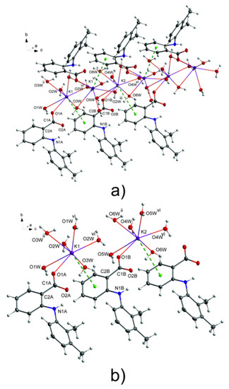Polymeric structure of potassium mefenamate–water (1/3). (a) Polymeric chain formed with K1 ions; (b) Polymeric chain created with K2 ions. Symmetry codes: ii = iii = x, y, z + 1; vi = x, −y + 3/2, z + 1/2. In the pictures the component O21A with a lower occupancy factor and the K⋯π interactions were omitted for clarity.