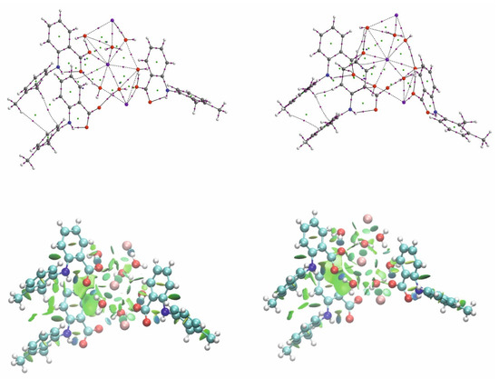 Comparison of QTAIM and NCI diagram for the investigated potassium mefenamate trihydrate. Left-K1 and K2-right. Carbon, hydrogen, nitrogen, oxygen and potassium atoms are marked as grey, white, blue, red and pink dots, respectively. Red, yellow and green dots represent bond-critical points-BCPs, ring-critical points-RCPs and cage-critical points-CCP, respectively. NCI isosurfaces are blue for attractive, red for repulsive and green for the intermediate interactions.