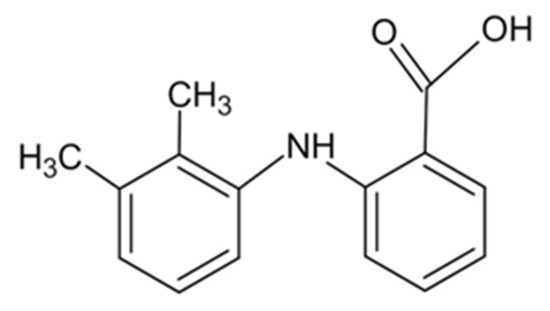 Mefenamic acid is a popular drug from the group of NSAIDs widely used in medicine. Due to the nature of fenamic acids, these drugs exist in a protonated (lipophilic) form (Scheme 1). In plasma, NSAIDs are highly ionized. Mefenamic acid is characterized by a strong analgesic effect and weaker anti-inflammatory, antiviral effect [1,2]. Mefenamic acid can be helpful in managing chronic pain of various etiologies, including neuropathic pain and cancer pain [3]. It may be equivalent or even more effective than other NSAIDs in chronic osteoarthritis, including in elderly patients [3]. However, it should be noted that when used for longer time, it causes serious side effects: skin allergic reactions, gastrointestinal disorders, and nephro-, hepato- and neurotoxicity.